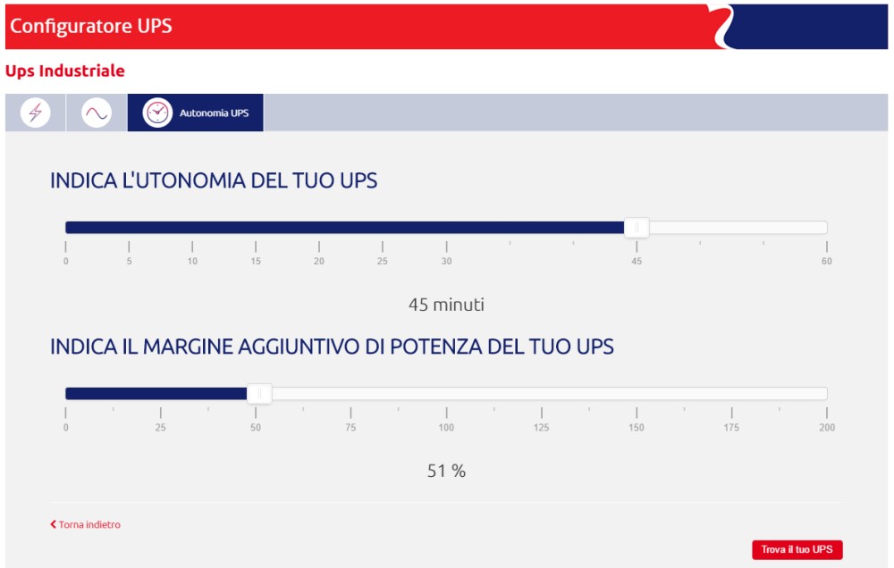 Lo strumento, totalmente online e fruibile da qualsiasi piattaforma, permette per prima cosa di selezionare il settore specifico di applicazione in cui deve essere installato l’UPS (SoHo, Data Center, medicale, industria, trasporti, emergenza) e successivamente propone all’utente una serie di domande utili a raccogliere i dati necessari per la scelta e il dimensionamento: potenza attiva o apparente, tipologia di installazione (tower, rack, dual), alimentazione da rete (input) e al carico (output) e infine l’autonomia necessaria, con la possibilità di inserire un margine di sovradimensionamento per una potenziale crescita futura dell’utenza.