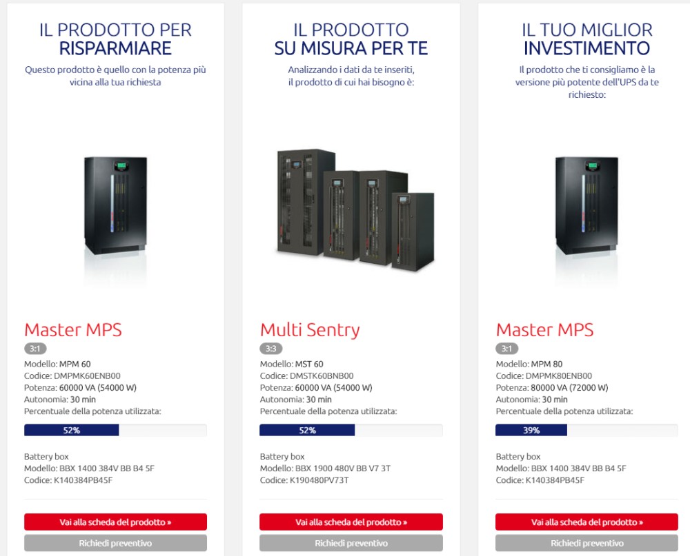 Le sezioni dedicate al mondo informatico, SoHo e Data Center sono state inoltre sviluppate utilizzando un database completo e continuamente aggiornato di device del mondo IT (PC, workstation, monitor, server, dispositivi di rete, router, eccetera) fra i quali gli utenti possono selezionare i dispositivi installati ottenendo così il dimensionamento più preciso del carico da proteggere.